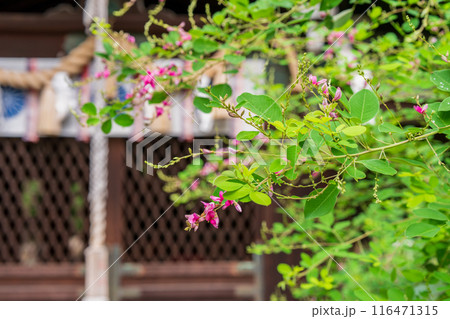 京都、梨木神社に咲く萩の花と拝殿と本殿が見える景色