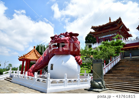 台湾 日月潭文武廟の赤獅子石像