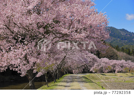 青空と新緑に映える満開の桜並木(小彼岸桜)〈名倉川沿い/愛知県北設楽郡〉