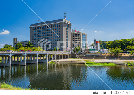 岡崎公園の河川敷と乙川(潜水橋、岡崎城、菅生神社方面)