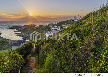 城ヶ島公園の夜明け 朝日を浴びる「安房崎灯台」と岬の風景【神奈川県・三浦市】
