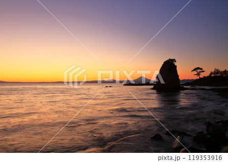 三浦市三崎町・高磯の岩礁に映る夕暮れの幻想的なアフターグロウ