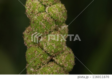 自然 植物 ミクリ、蕾状態の雄花の花序。緑色の小さな雄花が集まって丸い団子のようになっています