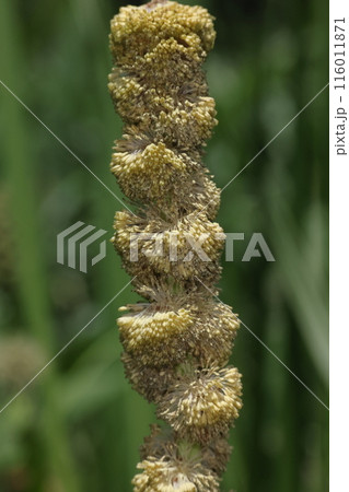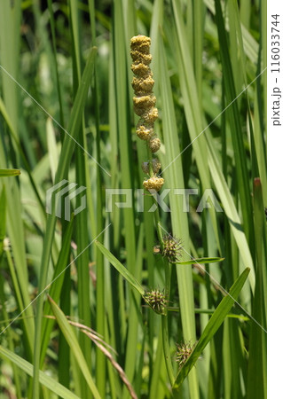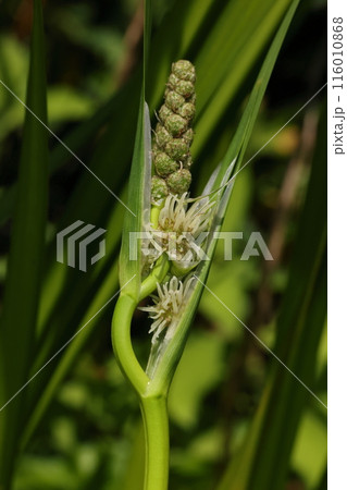 自然 植物 ミクリ、花をつけた茎の伸び始め。上に団子を積み重ねた様な雄花序と下に花柱が目立つ雌花序