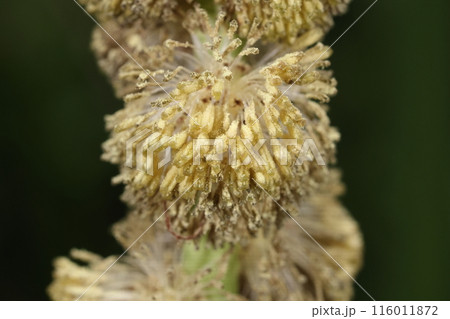 自然 植物 ミクリ、雌花の花序のアップです。白色の紐状のものはそれぞれの花の数ミリもある柱頭