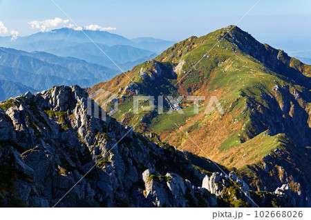 中央アルプス・宝剣岳稜線から見る紅葉の三ノ沢岳と恵那山