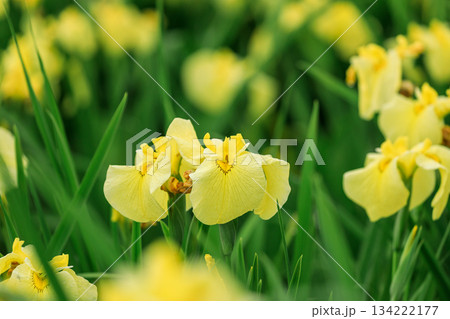 北海道苫小牧市、錦大沼ハナショウブ園で咲き誇るハナショウブ・金冠(種間交配種)