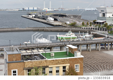 象の鼻スクエア遊歩道越しに見える大桟橋に停まる大型客船