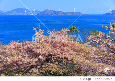 【愛媛県】快晴の来島海峡大橋と満開の河津桜(大角海浜公園)