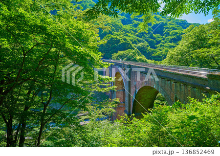 群馬県安中市のめがね橋(碓氷第三橋梁)と新緑
