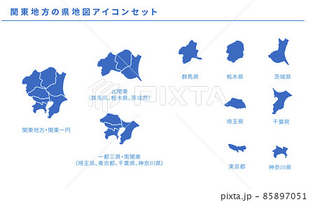 日本地図、関東地方の県地図アイコンセット、ベクター素材