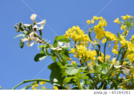 三陸つぼみ菜の黄色い花とルッコラの白い花、家庭菜園、野菜、花、食材、イメージ素材