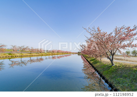 三重県松阪市 水路沿いに咲く笠松河津桜ロードとボート