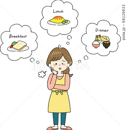 三食の献立を考える事にため息をつくエプロン姿の主婦
