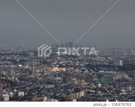 <鳥瞰>三鷹上空・新宿高層ビルの夕景と広がる街並み