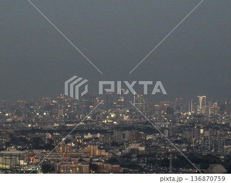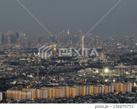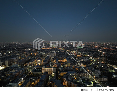 <鳥瞰>三鷹上空・東京スカイツリーと東京の街並みの夕景
