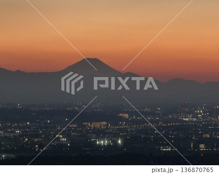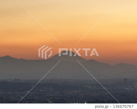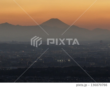 <鳥瞰>三鷹上空・夕景の富士山の下に広がる街