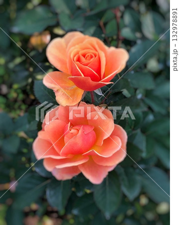 緑の葉と二輪のオレンジ色のバラが咲く春の風景
