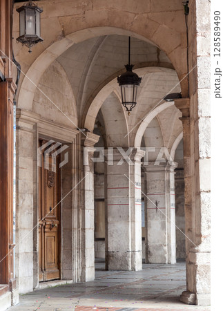 Charming stone arches and wooden door in the historic streets of Burgos, Spain during the afternoon