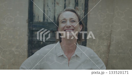 Smiling woman in collared shirt posing before wooden door and plaster wall, with chemical overlay