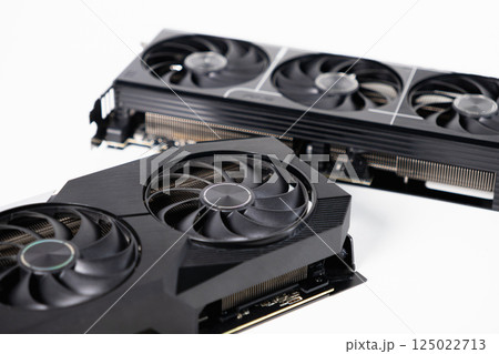 Two black graphics cards with cooling fans placed on white background, one with two coolers and another with three coolers for gaming PC