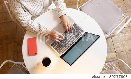 カフェでPC作業をしている女性の手元