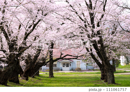 小岩井農場 上丸牛舎構内の小岩井農場資料館と満開の桜