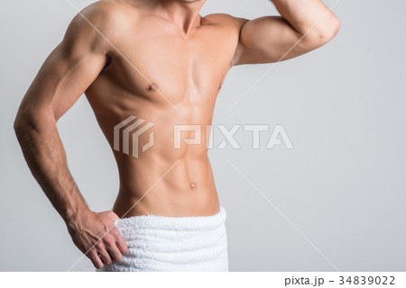 Handsome young man with muscular body posing shirtless in underwear against grey studio background. Relief hands