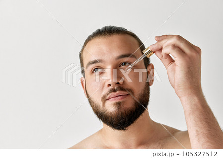 Closeup shoot of man looking away applies care product with pipette to area under eyes over grey background.