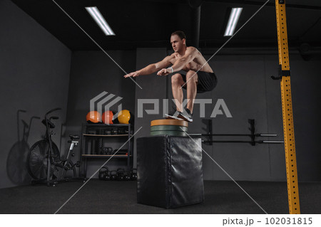 Close up of athletic Japanese man doing push ups focused expression muscular upper body shirtless indoor gym strength training healthy lifestyle determination fitness motivation
