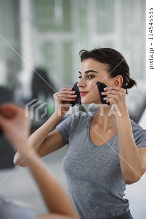 Facial skin care. A woman is doing a face massage using gouache stones.