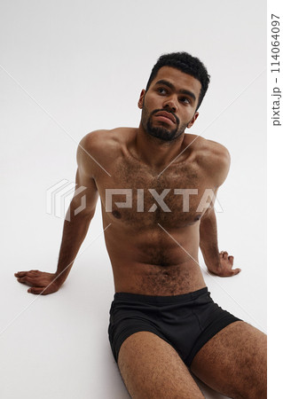 Bearded, handsome, young African-American man posing shirtless in underwear isolated on white background. Muscular body