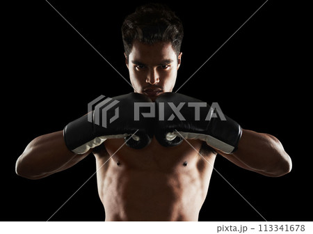 Portrait, man and boxer in stance for training, sports or workout for body health isolated on black background in studio. Fighter, serious face and athlete in gloves for fitness or exercise in Brazil
