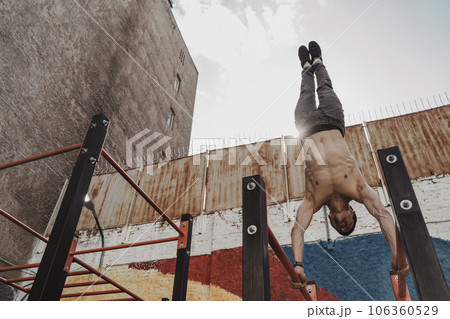 Young sportsman doing push ups on parallel bars at nature. Strong sporty man exercising at sports ground. Male shirtless athlete training hard outdoor. Concept of active sportive lifestyle. Slow mo