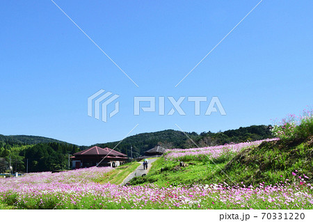 秋晴れの青空と上原高原に咲くコスモス