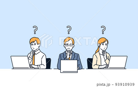 ノートパソコンの前で悩む3人のビジネスパーソンのシンプルなベクターイラスト素材