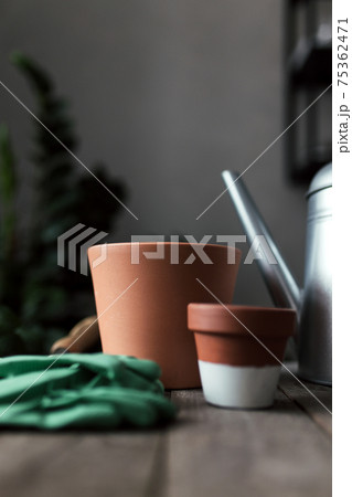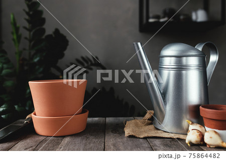 Ceramic pots on an old gray wooden table, tulip bulbs, watering can