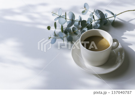 朝の光とコーヒーとユーカリの枝(白背景・コピースペース)