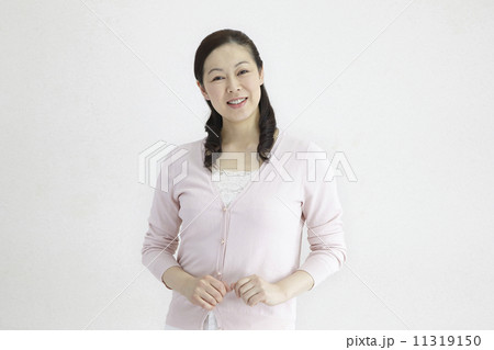 ナチュラルな笑顔で祈るポーズの若いアジア人女性たち