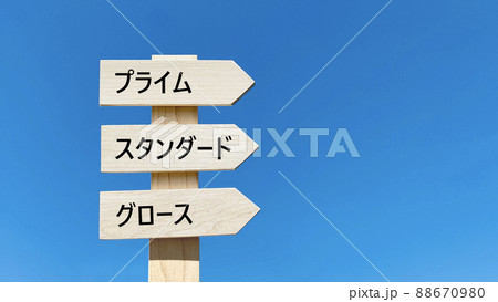 プライム、スタンダード、グロースの文字入り道しるべと青空_右空間