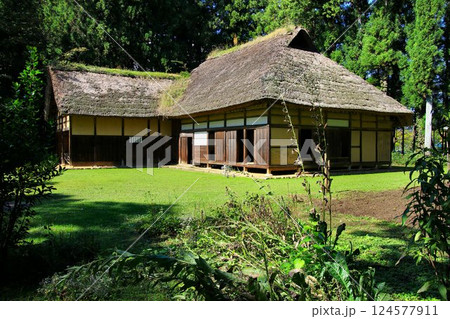 岩手県北上市のみちのく民族村の五月の風景 江戸時代から続く菅野家の茅葺き住宅の