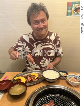 お昼の焼肉ランチの肉を焼く男性焼肉