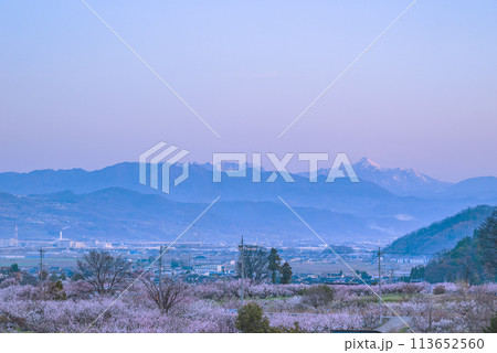 戸隠連峰モルゲンロートと眼下に広がるアンズの花【千曲市】