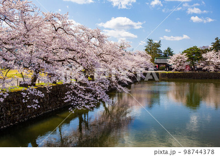 山形県米沢市 春の米沢城址のお堀と満開の桜