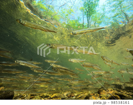 ワカサギの群を追うニジマス(北海道・然別湖)