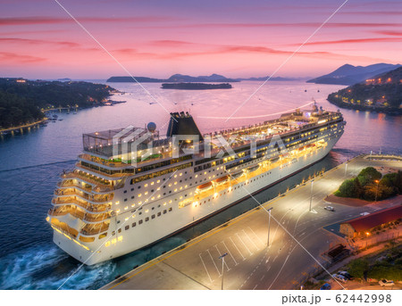 Aerial view of cruise ship in port at sunset in Dubrovnik, Croatia. Beautiful ships, boats