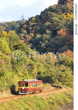 わたらせ渓谷鐵道「晩秋の山間部のカーブを走る列車」