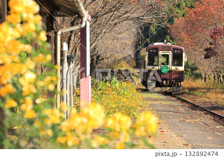 わたらせ渓谷鐵道「11月初旬の上神梅駅と列車」花々と紅葉に包まれて