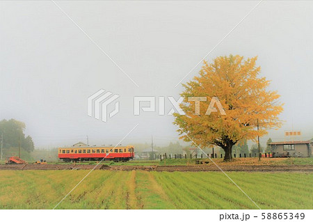 紅葉の夫婦銀杏とレトロ列車 小湊鉄道 上総大久保駅