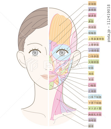 顔面右半分が筋肉解剖図の女性 人間の顔面 筋肉解剖図のイラスト
